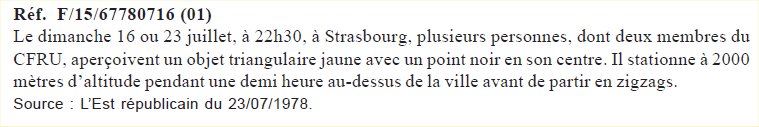 a) 9 juillet 1978. Vers 22 h 30, deux personnes circulaient en voiture sur l'autoroute entre Hautepierre et Bischeim lorsqu'elles aperçurent un objet volant de forme triangulaire jaune, avec un point noir en son centre. Les témoins arrêtèrent leur véhicule et observèrent tranquillement l'objet durant une demi-heure. D'autres témoignages, parmi lesquels celui d'un membre du C.F.R.U. [groupe d'ufologie local], vinrent appuyer cette observation nocturne.