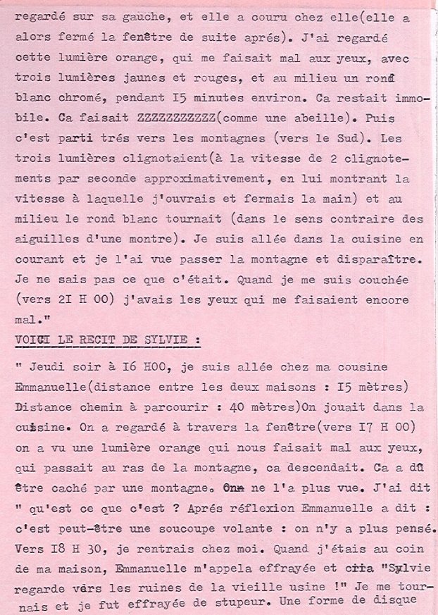 "Jeudi soir à 16 H 00, je suis allée chez ma cousine Emmanuelle. (distance entre les 2 maisons: 15 mètres - Distance chemin à parcourir: 40 m). On jouait dans la cuisine. On a regardé à travers la fenêtre (vers 17 H ). On a vu une lumière orange qui nous faisait mal aux yeux, qui passait au ras de la montagne, ça descendait. Ça a dû être caché par une montagne. On ne l'a plus vue. J'ai dit "qu'est ce que c'est? Après réflexion Emmanuelle a dit: c'est peut être une soucoupe volante ; on n'y a plus pensé. Vers 18 H 30, je rentrais chez moi. Quand j'étais au coin de ma maison, Emmanuelle m'appela effrayée et cria: Sylvie regarde vers les ruines de la vieille usine! Je me tournais et je fus effrayée de stupeur. Une forme de disque orange avec trois lumières, dont le dessus était en rouge