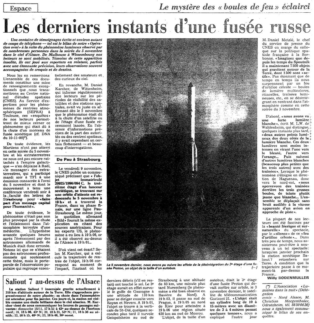Nous les en remercions. L'ensemble de ces documents constitue une mine de renseignements exceptionnels que nous transmettons au Centre national d'études spatiales (CNES). Au Service d'expertise pour les phénomènes de rentrées atmosphériques (SEPRA) à Toulouse, ces "enquêtes" de nos lecteurs permettront de mieux cerner ce phénomène qui était dû à la chute d'un morceau de fusée soviétique (cf. DNA du 10-11-90)*).