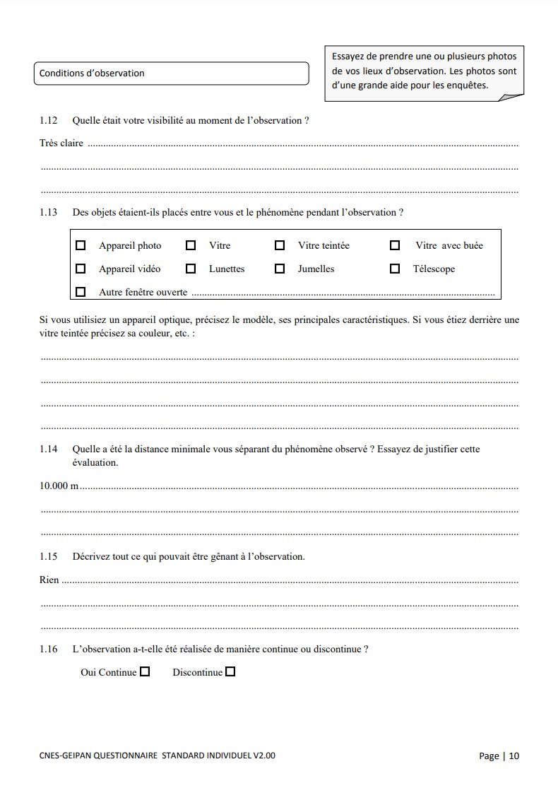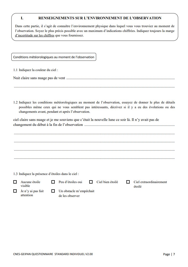 Invité par le GEIPAN à remplir leur questionnaire, il y rapportait par copier - collé ce qu'il leur avait déjà déclaré par courriel:
