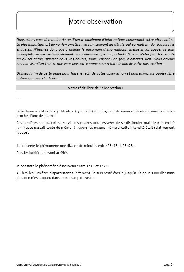 Votre ObservationNous allons vous demander de restituer le maximum d'informations concernant votre observation. Le plus important est de ne rien omettre : ce sont souvent les détails qui permettent de résoudre les enquêtes. N'hésitez donc pas à donner le maximum d'informations, même si vos souvenirs sont incomplets ou que certains éléments vous paraissent peu importants. Si vous n'êtes plus très sûr de tel ou tel détail, signalez-nous vos doutes, mais, encore une fois, n'omettez rien. Nous devons pouvoir visualiser tout ce que vous avez vu, comme pour refaire le film de votre observation. Utilisez la fin de cette page pour faire le récit de votre observation et poursuivez sur papier libre autant que vous le désirez: Votre récit libre de l'observation: Deux lumières blanches / bleutés (type halo) se 'dirigeant' de manière aléatoire mais restantes proches l'une de l'autre. Ces lumières semblaient se servir des nuages pour essayer de se dissimuler mais leur intensité lumineuse passait toute de même à travers les nuages même si cette intensité était relativement 'douce'. J'ai observé le phénomène une dizaine de minutes entre 23h15 et 23h25. Puis les lumières se sont arrêtés. Je constate le phénomène à nouveau entre 1h15 et 1h25. A 1h25 les lumières disparaissent subitement. Je suis resté éveillé jusqu'à 2h pour surveiller mais plus rien n'est apparu dans mon champ de vision. |