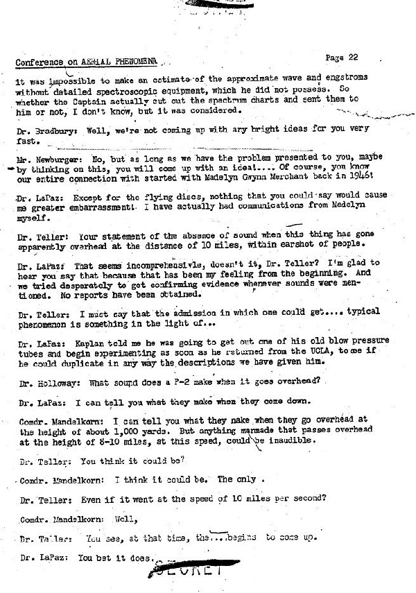 Ceci est une des 24 pages de l'un des documents officiels initialement secrets concernant ce problème. Ces pages sont les minutes d'une importante conférence qui s'est tenue à Los Alamos le 16 février 1949. Des représentants de l'Armée US, du FBI, de l'Air Force et des scientifiques s'étaient réunis. Le Dr. La Paz avait passé deux ans à pister les aérolithes verts et explique ses découvertes. Le Dr. Edward Teller, l'un des pères de la bombe atomique, pose ses questions.