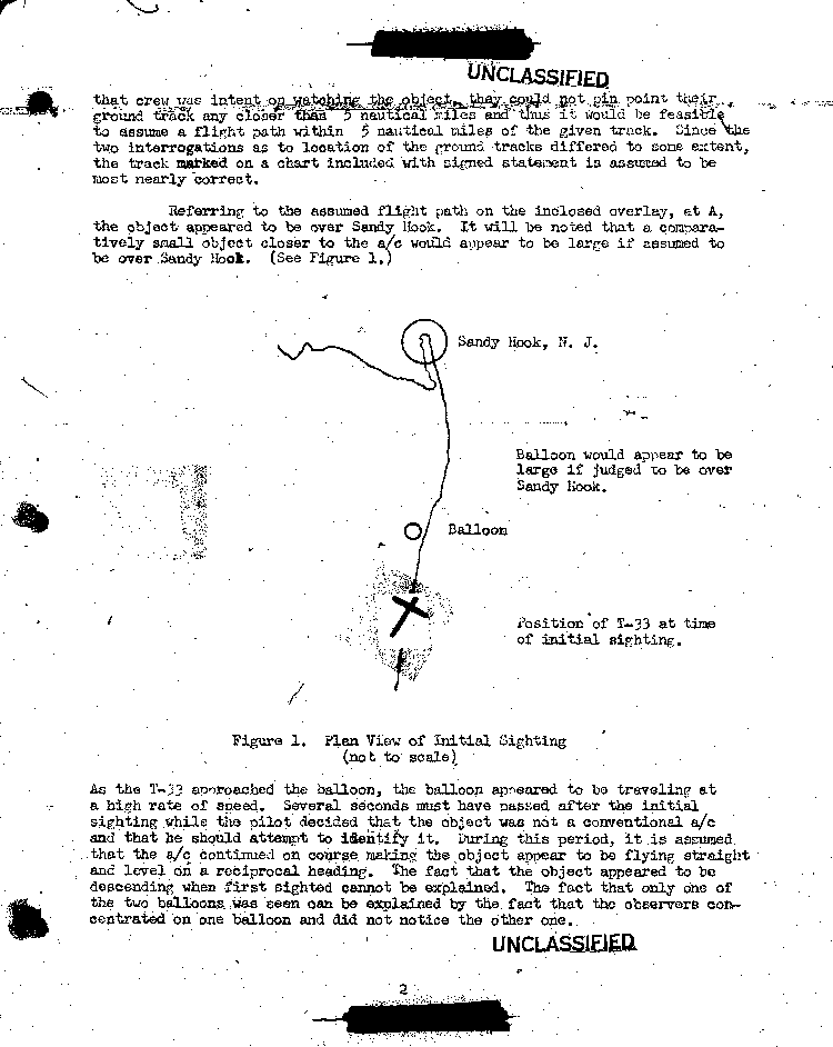 Tandis que le T-33 a approché le ballon, le ballon a semblé voyager à une vitesse élevée. Plusieurs secondes doivent s'être écoulées après l'observation initiale tandis que le pilote décidait que l'objet n'était pas un avion conventionnel et qu'il devrait essayer de l'identifier. Pendant cette période, on suppose que l'avion a continué sur son cours ce qui a fait paraître voler l'objet droit et à niveau constant dans le sens opposé à celui de l'avion. Le fait que l'objet a semblé être en train de descendre quand il a d'abord été vu ne peut pas être expliqué. Le fait que seulement un des deux ballons a été vu peut être expliqué par le fait que les observateurs se sont concentrés sur un des ballons et n'ont pas remarqué l'autre.