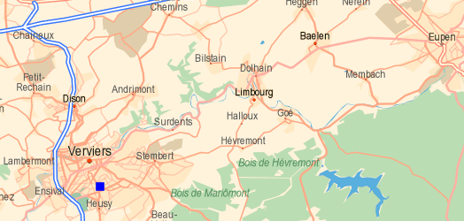 Ci-dessus: Localisation de l'observation (carré bleu) relativement à Verviers et Eupen.