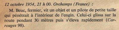 Mardi 12 octobre 1954[...] 21:00 A Orchamps (France), M. Beuc (fermier) voit un objet et un pilote de petite taille qui pénétre [sic] à l'intérieur de l'engin. Celui-ci glisse sur la route pendant 30 m puis s'élève rapidement. [...] |