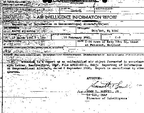 "Alors que je volais dans le siège de gauche sur un trajet à 230 degrés à la position 49-50 Nord et 50-03 Ouest, j'ai observé une lueur au-dessous de l'horizon à environ 1.000 à 1.500 pieds au-dessus de l'eau. Nous avons observé son cours et mouvement pendant environ 4 ou 5 minutes avant d'attirer l'attention des autres membres d'équipage... Soudainement son angle d'attaque a changé, son altitude et sa taille ont augmentés comme si sa vitesse dépassait les 1.000 miles par heure. Elle s'est rapprochée tellement rapidement que notre première impression était que nous allons vers une collision en plein air. En fait son angle a changé et sa couleur a changé. Il est ensuite [apparu] comme sans aucun doute circulaire, orange rougeâtre sur son périmètre. Il a inversé son vol et a triplé sa vitesse jusqu'à ce qu'il ait disparu hors de vue au-dessus de l'horizon. En raison de notre altitude et distance trompeuse au-dessus de l'eau il est presque impossible d'estimer sa taille, distance, et vitesse. Une évaluation grossière serait d'au moins 300 pieds de diamètre, d'une vitesse de plus de 1.000 miles par heure, et il s'est approchée à moins de 5 miles de l'avion."