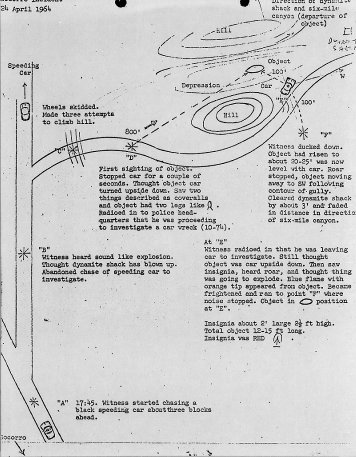 Zamora drove toward the object, along the hill's crest, for about 50 feet and then stopped the car. He radioed back to the sheriff's office that he would be busy checking on a wreck "down in the arroyo," and then he descended on foot down the hill toward the object.