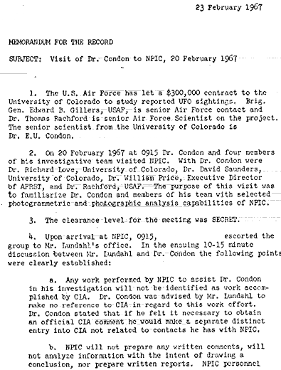 Le NPIC travaillera pour aider le Dr Condon dans "sa" recherche, mais rien ne sera fait par écrit. M. Lundahl de la C.I.A dit au Dr Condon de ne faire aucune référence au travail de la CIA. Si le Dr Condon a besoin de quelque chose de la CIA d'une façon officielle, on le fera de sorte que personne ne puisse suspecter que le NPIC fasse n'importe quel travail que le Dr. Condon est censé faire en toute indépendance.