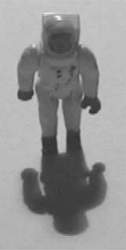 Le contre-jour est encore une fois idéal, bien débouché sans flash et encore plus surprenant, si l'on regarde le reflet dans la visière du casque, on aperçoit des ombres qui partent dans deux directions différentes. J'ai beau regarder dehors, je ne vois pas deux soleils. Encore une fois, l'arrière-plan de la photo s'estompe et s'assombrit sans aucune raison valable. Pourquoi le coté de la combinaison est il éclairé par un soleil brillant qui n'éclaire pas le sol derrière l'astronaute ? Et que penser de l'ombre des jambes de l'astronaute visible dans la visière du casque ? Il est éclairé de face et se trouve en face de l'autre qui lui est éclairé de côté! Dernier point, regardez l'instrument que l'astronaute tient dans sa main, la partie inférieure n'est pas raccordée à la partie supérieure. Trop c'est trop! |