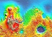 Voici une autre image de la surface Martienne, en fausses couleurs. L'intention est de montrer les altitudes de la surface dans des couleurs vives, variées et fausses afin d'indiquer au spectateurs la présence d'un cratère d'impact de météorite: