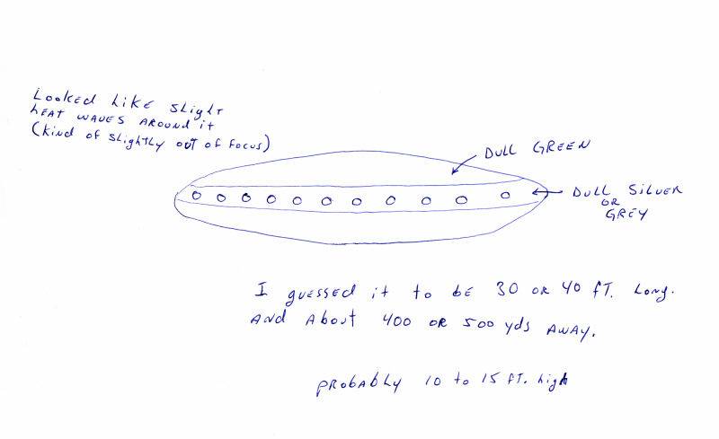 Je me tenais juste devant ma moto, observant les montagnes au Sud, quand j'ai remarqué vers la gauche du coin de mon oeil, ce dont j'ai d'abord pensé que c'était un avion. C'était de 400 à 500 mètres de distance et à peu près de la taille d'un avion DC-3 ou d'un autobus scolaire ordinaire.