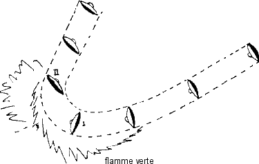 Quant aux cigares, si l'on suppose qu'ils sont constitués d'une carlingue avec deux Soucoupes en bout, on voit immédiatement (fig. 5) qu'ils doivent être inclinés sur l'horizon à basse vitesse, cette inclinaison étant à peu près celle des axes d'éventuelles Soucoupes convoyeuses.