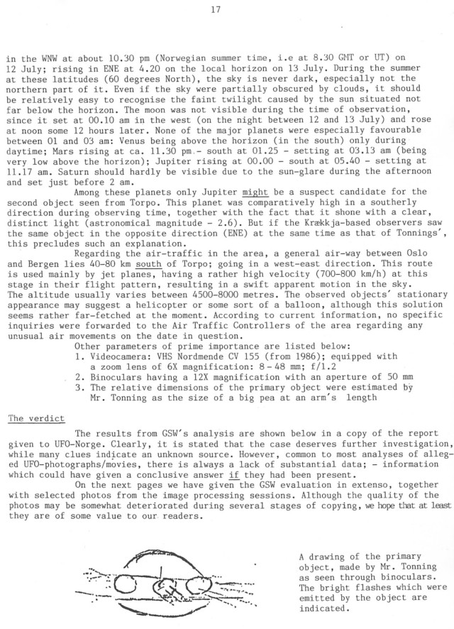 in the WNW at about 10.30 pm (Norwegian summer time, i.e at 8.30 GMT or UT) on 12 July; rising in ENE at 4.20 on the local horizon on 13 July. During the summer at these latitudes (60 degrees North), the sky is never dark, especially not the northern part of it. Even if the sky were partially obscured by clouds, it should be relatively easy to recognize the faint twilight caused by the sun situated not far below the horizon. The moon was not visible during the time of observation, since it set at 00.10 am in the west (on the night between 12 and 13 July) and rose at noon some 12 hours later. None of the major planets were especially favorable between 01 and 03 am: Venus being above the horizon (in the south) only during daytime; Mars rising at ca. 11.30 pm.- south at 01.25 setting at 03.13 am (being very low above the horizon); Jupiter rising at 00.00 south at 05.40 setting at 11.17 am. Saturn should hardly be visible due to the sun-glare during the afternoon and set just before 2 am. Among these planets only Jupiter might be a suspect candidate for the second object seen from Torpo. This planet was comparatively high in a southerly direction during observing time, together with the fact that it shone with a clear, distinct light (astronomical magnitude 2.6). But if the Kraekkja-based observers saw the same object in the opposite direction (ENE) at the same time as that of Tonnings', this precludes such an explanation. Regarding the air-traffic in the area, a general air-way between Oslo and Bergen lies 40-80 km south of Torpo; going in a west-east direction. This route is used mainly by jet planes, having a rather high velocity (700-800 km/h) at this stage in their flight pattern, resulting in a swift apparent motion in the sky. The altitude usually varies between 4500-8000 meters. The observed objects' stationary appearance may suggest a helicopter or some sort of a balloon, although this solution seems rather far-fetched at the moment. According to current information, no specific inquiries were forwarded to the Air Traffic Controllers of the area regarding any unusual air movements on the date in question. Other parameters of prime importance are listed below: