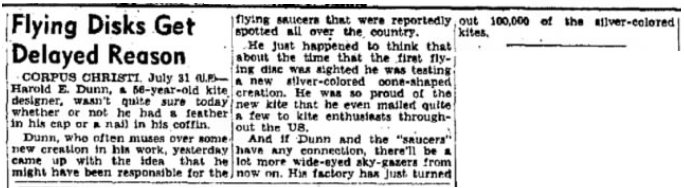 Il est arrivé à penser que, à peu près au moment où le premier disque volant était aperçu, il testait une nouvelle création en forme de cône de couleur argentée. Il était tellement fier du nouveau cerf-volant qu'il en avait même envoyé de nombreux à des passionnés de cerf-volant à travers tous les Etats-Unis.