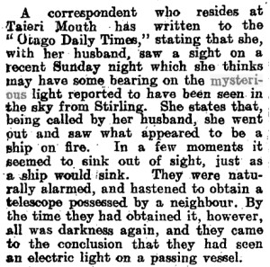Un correspondant qui réside à Taieri Mouth a écrit à l'Otago Daily Times, affirmant qu'elle, avec son mari, a vu un spectacle lors d'un récent Dimanche soir qu'elle pense pouvoir avoir une incidence sur la mystérieuse lumière qui aurait été vu dans le ciel de Stirling. Elle affirme qu'étant appelée par son mari, elle est sortie et a vu ce qui semblait être un navire en feu. En quelques instants, il a semblé couler hors de la vue, tout comme un bateau sombrerait. Ils étaient naturellement inquiets, et se hâtèrent de chercher un télescope possédé par un voisin. Au moment où ils avaient l'obtenu, Cependant, tout était de nouveau obscur, et ils sont arrivés à la conclusion qu'ils avaient vu une lumière électrique sur un navire de passage.