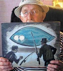 Charles Hickson, de Gautier, tient une illustration qui a été faite pour sa participation au Dick Cavett Show à New York. Hickson et Calvin Parker qui avait alors 19 ans ont été enlevés et examinés par un OVNIS alors qu'ils étaient à la pêche sur Gulf Coast en 1973. |