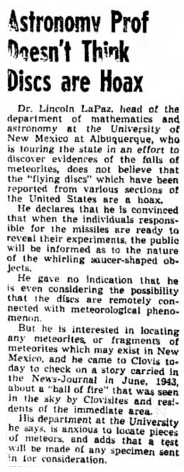 Le docteur Lincoln LaPaz, chef du département des mathématiques et de l'astronomie à l'Université du Nouveau-Mexique à Albuquerque, qui parcourt l'état dans un effort pour découvrir les chutes de météorites, ne croit pas que les "disques volants" qui ont été rapportés dans diverses sections des Etats-Unis, sont un canular.
