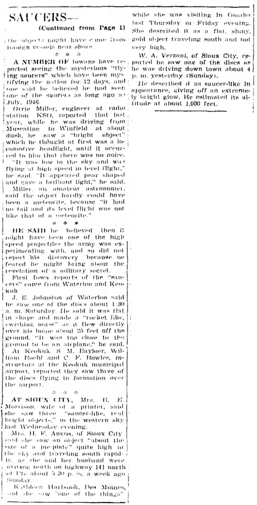 First Iowa reports of the "saucers" came from Waterloo and Keokuk.