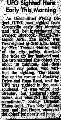 Un objet volant non identifié (OVNI) a été aperçu à Greenville tôt ce matin et sera étudié par le projet Bluebook, Wright-Patterson AFB. L'objet a été aperçu pour la première fois à 2h10 du matin aujourd'hui par Mme Thomas Hanes, épouse du directeur de la sécurité de la ville. Elle a réveillé son mari et les deux ont observé l'objet pendant environ 10 minutes, puis ont alerté la police de la ville, qui a vérifié l'observation. Les Hanes vivent au coin de Parkway Drive et Russ Road, et l'OVNI a été aperçu dans le sud-est. "Il était blanc et circulaire, mais il clignotait d'autres couleurs et changeait parfois de forme", a déclaré le Directeur de la Sécurité Hanes. Deux policiers de la ville et les Hanes ont observé l'objet pendant près d'une heure.