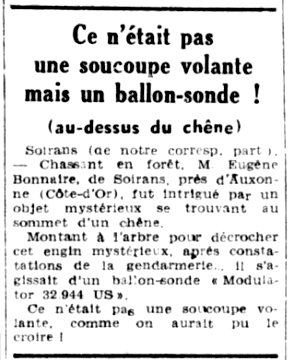 Soirans (de notre corresp. part.). -- Chassant en forêt, M. Eugène Bonnaire, de Soirans, près d'Auxonne (Côte-d'Or) fut intrigué par un objet mystérieux se trouvant au sommet d'un chêne.