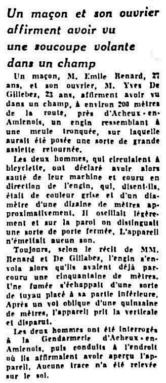 Un maçon, M. Emile Renard, 27 ans, et son ouvrier, M. Yves de Gillebez, 23 ans, affirment avoir vu dans un champ, à environ 200 mètres de la route, près d'Acheux-en-Amiénois, un engin ressemblant à une meule tronquée, sur laquelle aurait été posée une sorte de grande assiette retournée.