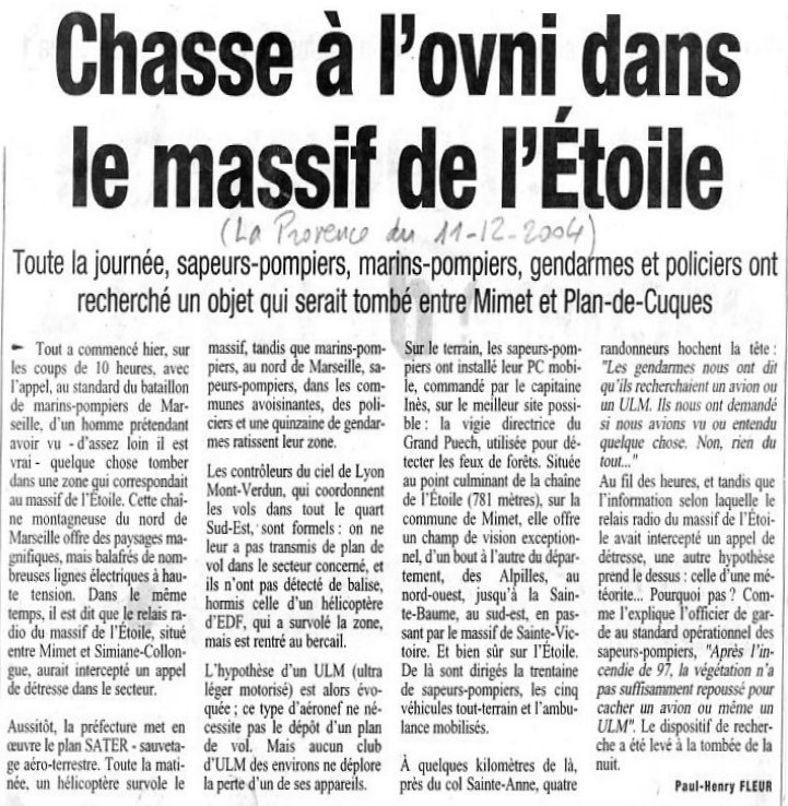 Tout a commencé hier, sur les coups de 10 heures, avec l'appel, au standard du bataillon des marins-pompiers de Marseille, d'un homme prétendant avoir vu - d'assez loin il est vrai - quelque chose tomber dans une zone qui correspondait au massif de l'Etoile. Cette chaîne montagneuse du nord de Marseille offre des paysages magnifiques, mais balafrés de nombreuses lignes électriques à haute tension. Dans le même temps, il est dit que le relais radio du massif de l'Etoile, située entre Mimet et Simiane-Collongue, aurait intercepté un appel de détresse dans le secteur.