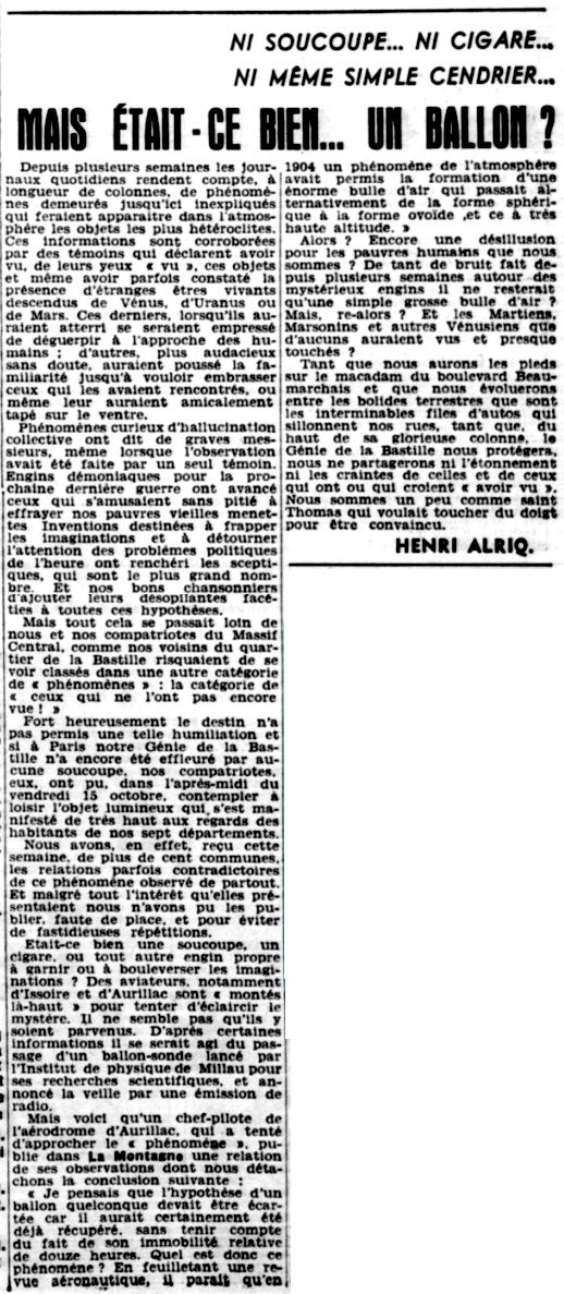 Fort heureusement le destin n'a pas permis une telle humiliation et si à Paris notre Génie de la Bastille n'a encore été effleuré par aucune soucoupe, nos compatriotes, eux, ont pu, dans l'après-midi du 15 octobre, contempler à loisir l'objet lumineux qui s'0est manifesté de trèS haut aux regards des habitants de nos sept départements.