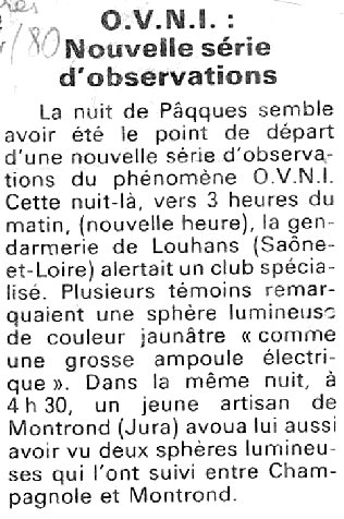 Easter night seems to have been the starting point for a new series of sightings of the U.F.Os. That night, around 3 a.m. (new time), the gendarmerie of Louhans (Saône-et-Loire) alerted a specialized club. Several witnesses noticed a luminous sphere of yellowish color "like a large electric bulb". That same night, at 4:30 a.m., a young craftsman from Montrond (Jura) also confessed to having seen two luminous spheres which followed him between Champagnole and Montrond.