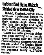 Later, a similar glowing object was seen moving at a terrific speed upward over the Bristol Channel before disappearing, this report added. On Sunday night two youths at nearby Long Ashton reported seeing a flying saucer.