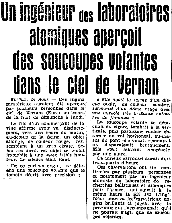 Le fils d'un commerçant de la ville affirme avoir vu distinctement, vers une heure du matin, au-dessus de la Seine, un objet allongé, de couleur rouge, ressemblant à un gros cigare. Selon ses dires, cet objet se tenait immobile à une assez faible hauteur. Le silence était total.