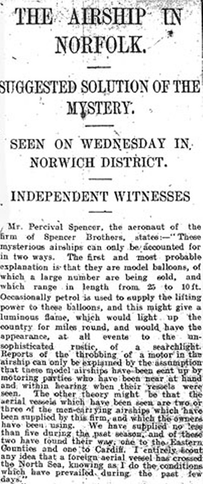 Mr. Percival Spencer, l'aéronaute de la forme Spencer Brothers, déclare: -- "Ces dirigeables mystérieux ne peuvent être pris en compte que deux façons. La première et la plus probable explication est qu'ils sont des ballons miniatures, dont est grand nombre est vendu, et qui ont une longueur de 25 à 10 pieds. Parfois de l'essence est utilisée pour fournir la puissance de levage de ces ballons, ce qui pourrait donner une flamme lumineuse, qui illuminera le pays sur des kilomètres à la ronde, et aurait l'apparence, en tout cas d'être la simplicité rustique d'un projecteur. Les rapports de la pulsation d'un moteur à bord du dirigeable ne peuvent être expliqués que par l'hypothèse que ces dirigeable modèles réduits ont été envoyés par des gens de l'automobile qui étaient à portée de main et à portée de voix lorsque leurs vaisseaux ont été observés. L'autre théorie pourrait être que les vaisseaux aériens qui ont été observés portant deux ou trois hommes sont ces des dirigeables qui ont été fournis par notre entreprise, et que les propriétaires ont utilisés. Nous en avons fourni pas moins de cinq au cours de la dernière saison, et de ceux-là deux ont trouvé leur chemin, l'un dans les Comtés de l'Est et l'autre à Cardiff. Je doute entièrement qu'un navire aérien étranger ait traversé la mer du Nord, ayant connaissance des conditions qui ont prévalu au cours de ces derniers jours".