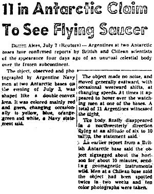 An earlier report from a British Antarctic base said the object zigzagged about the horizon for about 10 minutes, sending geomagnetic instruments wild. Men at a Chilean base said the object had been spotted twice in two weeks and ten color photographs were taken.