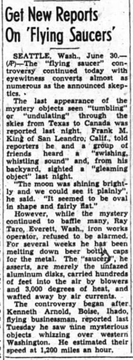 Cependant, alors que le mystère continuait à déconcerter beaucoup de gens, Ray Taro, d'Everett, Washington, ppérateur de travail du fer, a refusé d'être alarmé. Depuis plusieurs semaines, il a fondu des bouchons de bière pour le métal. Les "soucoupes," affirme-t-il, ne sont que des disques en aluminium, portàs à des centaines de pieds dans l'air par des soufflantes et 3000 degrés de chaleur et s'écoulant par les courants de l'air.