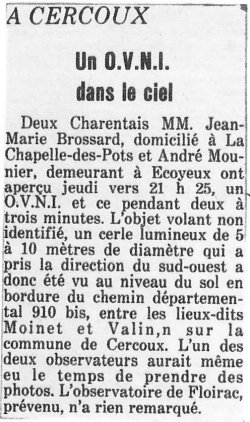 Deux Charentais MM. Jean-Marie Brossard, domicilié à La Chapelle-des-Pots et André Mounier, demeurant à Ecoyeux ont aperçu jeudi vers 21 h 25, un O.V.N.I. et ce pendant deux à trois minutes. L'objet volant non identifié, un cerle lumineux de 5 à 10 mètres de diamètre qui a pris la direction du sud-ouest a donc été vu au niveau du sol en bordure du chemin départemenal 910 bis, entre les lieux-dits Moinet et Valin,n sur la commune de Cercoux. L'un des deux observateurs aurait même eu le temps de prendre des photos. L'observatoire de Floirac, prévenu, n'a rien remarqué.