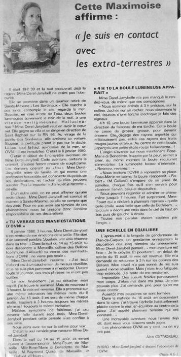 January 9, 1980, 3 a.m. Mrs. Derel-Janybell has recovered from her emotions of the day before. She sleeps peacefully. Suddenly, a voice echoes in her head. "On the night of August 14 to 15, you must go down to Marseille, Bellons hill (municipality of Alauch) you will see UFO manifestations, don't come alone."