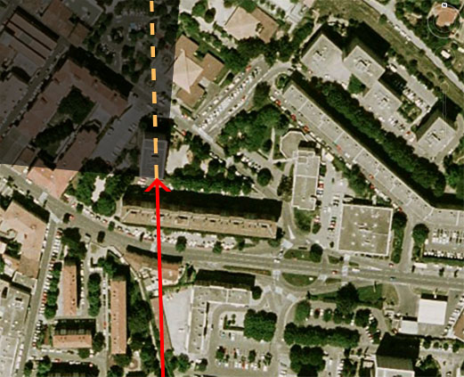 J'ai aussi joint la trajectoire de l'objet: la zone sombre est ce qui ne m'est pas observable depuis mon balcon. La fléche rouge désigne le sens de la trajectoire observée, les pointillés oranges sont l'extension de cette trajectoire. J'ai essayé de le repérer en vain de l'autre coté de l'immeuble toujours depuis mon balcon mais l'objet était certainement situé dans la zone sombre de l'image.