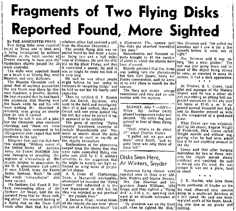 (A Spokane, le colonel Frank D. Hackell, commandement du Spokane Air Depot, a déclaré à l'Associated Press qu'il ne "savait rien" à propos de la découverte d'un disque volant sur la côte du Golfe du Texas, sinon que son bureau de relations publiques avait reçu un appel du Houston Chronicle.)