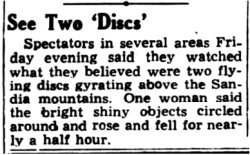 Des spectateurs dans plusieurs régions, vendredi soir, ont déclaré qu'ils ont regardé ce qu'ils pensaient être deux disques volants tournoyant au-dessus des montagnes de Sandia. Une femme a dit que les objets brillants et clairs décrivaient des cercles et se sont élevés et sont tombés pendant près d'une demi-heure.