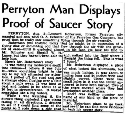 Robertson s'est rendu compte aujourd'hui qu'il pourrait être en possession d'un disque volant ou de quelque chose d'étrange qui a volé dans l'air avec la plus grande facilité - jusqu'à ce qu'il ait explosé presque devant son visage. Il a ammené sa découverte à Mr. Schuster et au shérif W. H. Lance, mais ils n'ont pas pu l'aider.