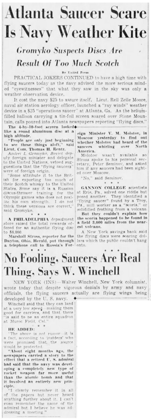 Cela a coûté à la Navy 25 $ pour s'en assurer. Le lieutenant Rell Zelle Moore, agent aéronautique de la station d'aviation navale, a lancé un dispositif météorologique "ray winds" [sic, "Rawin"] en une "opération soucoupe" de 25 $ à Atlanta, en Géorgie. En tant que ballon rempli d'hélium portant une feuille d'aluminium l'écran a grimpé sur les montagnes de Stone, les appels se sont déversés dans les journaux d'Atlanta déclarant des "disques volants".