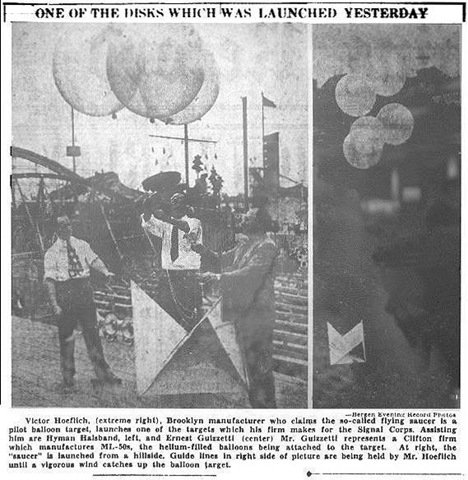 Victor Hoeflich, (à l'extrême droite), le constructeur de Brooklyn qui prétend que les soi-disant soucoupes volantes sont une cible de radar à ballon pilote, lance une des cibles que son entreprise fabrique pour le Signal Corps. Il est assisté de Hyman Halsband, à gauche, et Ernest Guizzetti (centre). Mr. Guizzetti représente une entreprise de Clifton qui fabrique des MI-50, les ballons remplis d'hélium qui sont attachés à la cible. A droite, la "soucoupe" est lancée depuis un flanc de colline. Les lignes de guidage du côté droit de l'image sont détenues par M. Hoeflich jusqu'à ce qu'un vent vigoureux emporte la cible du ballon.