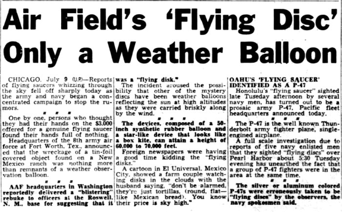 Le quartier général de la 8ème armée de l'air de l'armée à Fort Worth, Texas, a annoncé que l'épave d'un objet couvert de papier alu trouvée sur un ranch du Nouveau-Mexique n'était rien de plus que les restes d'un ballon d'observation météorologique.