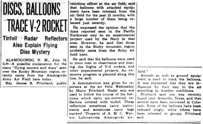 A demonstration was given for reporters at the air field Wednesday by Major Pritchard. Radar sets are used to follow the course of the balloons which carry six-cornered reflectors covered with tinfoil. These reflectors sometimes carry instruments and sometimes carry tags marked "Property of A. M. C. Watson Laboratories, Alamogordo air field."