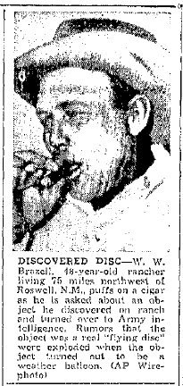 DISQUE DECOUVERT. -- W. W. Brazell [sic], rancher de 48 ans, vivant à 76 miles au nord-ouest de Roswell, N.M., tire sur un cigare alors qu'on lui pose des questions sur un objet qu'il a découvert sur le ranch et qu'il a remis au renseignement de l'Armée. Les rumeurs selon lesquelles l'objet était un véritable "disque volant" ont été expliquées lorsque l'objet s'est avéré être un ballon météorologique. (A.P. Photo-câble) [(A.P. Wire-photo)] |