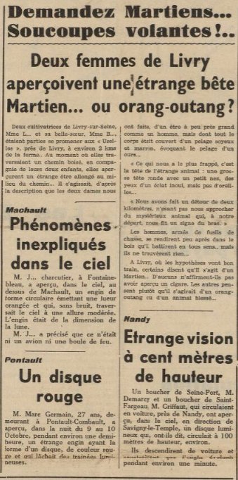 In 1958, ufologist Aimé Michel noted a case in Machault dated October 11, 1954, according to the newspapers Le Figaro, L'Aurore, Le Parisien Libéré for October 13 and 14, 1954, and Sud-Ouest and Ouest France for October 14, 1954.