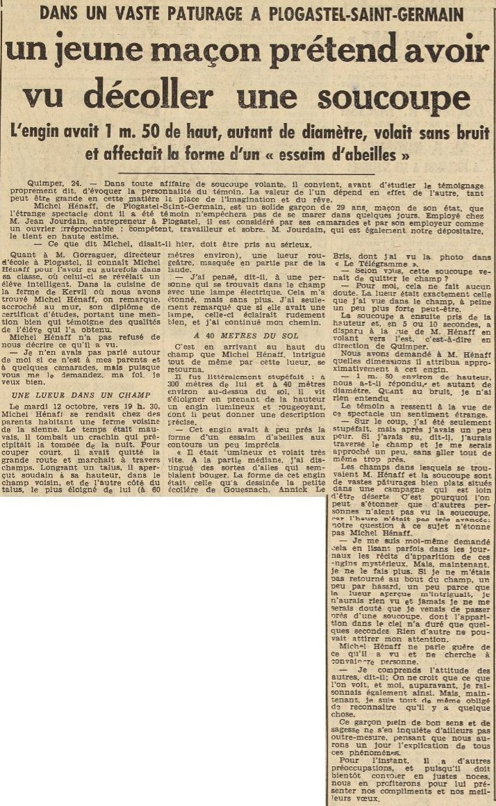 L'ufologue et auteur Jean Sider a appris par un article du journal Le Télégramme, de Brest, paru le 23 octobre 1954 en page 3, que le 12 octobre 1954, à 19:30, à Plogastel-Saint-Germain, dans le Finistère, Michel Hénaff, un maçon de 29 ans qui passait le long d'un champ, a vu soudain s'élever dans le ciel, comme s'il venait de décoller, un objet sphérique d'environ 1m50 de diamètre.