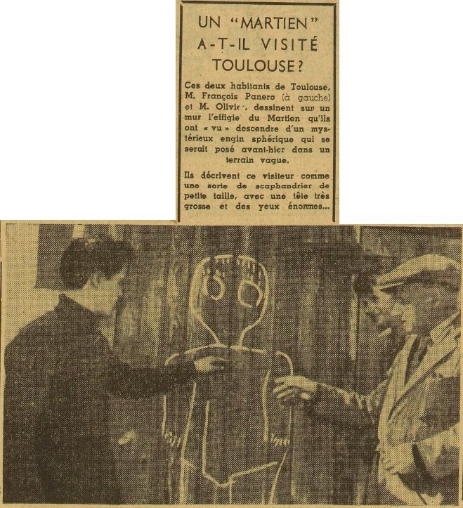 TOULOUSE. -- A short-sized diver with a disproportionately large head and enormous eyes - this is the description given by a Toulousain, Mr. Olivier, of a mysterious figure who emerged from a spherical craft that had just landed at 7:35 PM on a vacant lot.