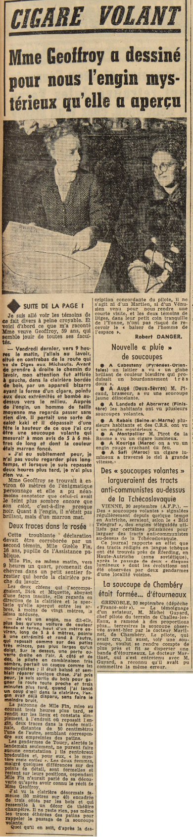 The article below was published in the daily newspaper France Soir, Paris, France, pages 1 and 7, on October 1, 1954.